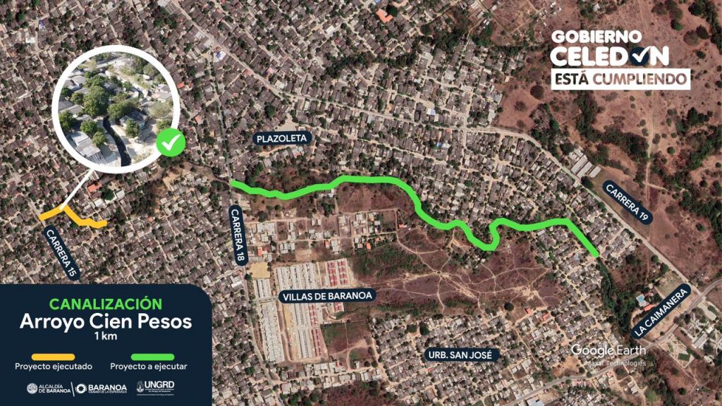 En el Arroyo Cien Pesos se contempla la canalización desde el puente sobre la vía a Usiacurí hasta la Calle 33, en el barrio Villa Eleyla y beneficiará a los barrios España, Cien Pesos, 11 de Noviembre y Villa Eleyla. Es más de 1 kilómetro de cauce que será canalizado en concreto hidráulico con una inversión de $14.627 millones. “La obra ya fue adjudicada y en las próximas semanas se dará inicio”, agregó el primer mandatario local.