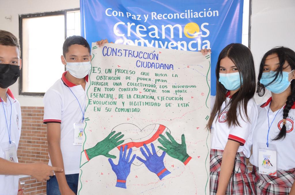 Al final de los talleres, se realiza un encuentro para la prevención y la resolución asertiva de conflictos con actividades lúdicas y simbólicas, en las que los participantes expresan los conocimientos aprendidos. Es decir, por medio de expresiones artísticas, los estudiantes se encargan de multiplicar y llevar a la práctica los recursos aprendidos para la construcción de paz y cultura de no violencia en lugares estratégicos de cada municipio.